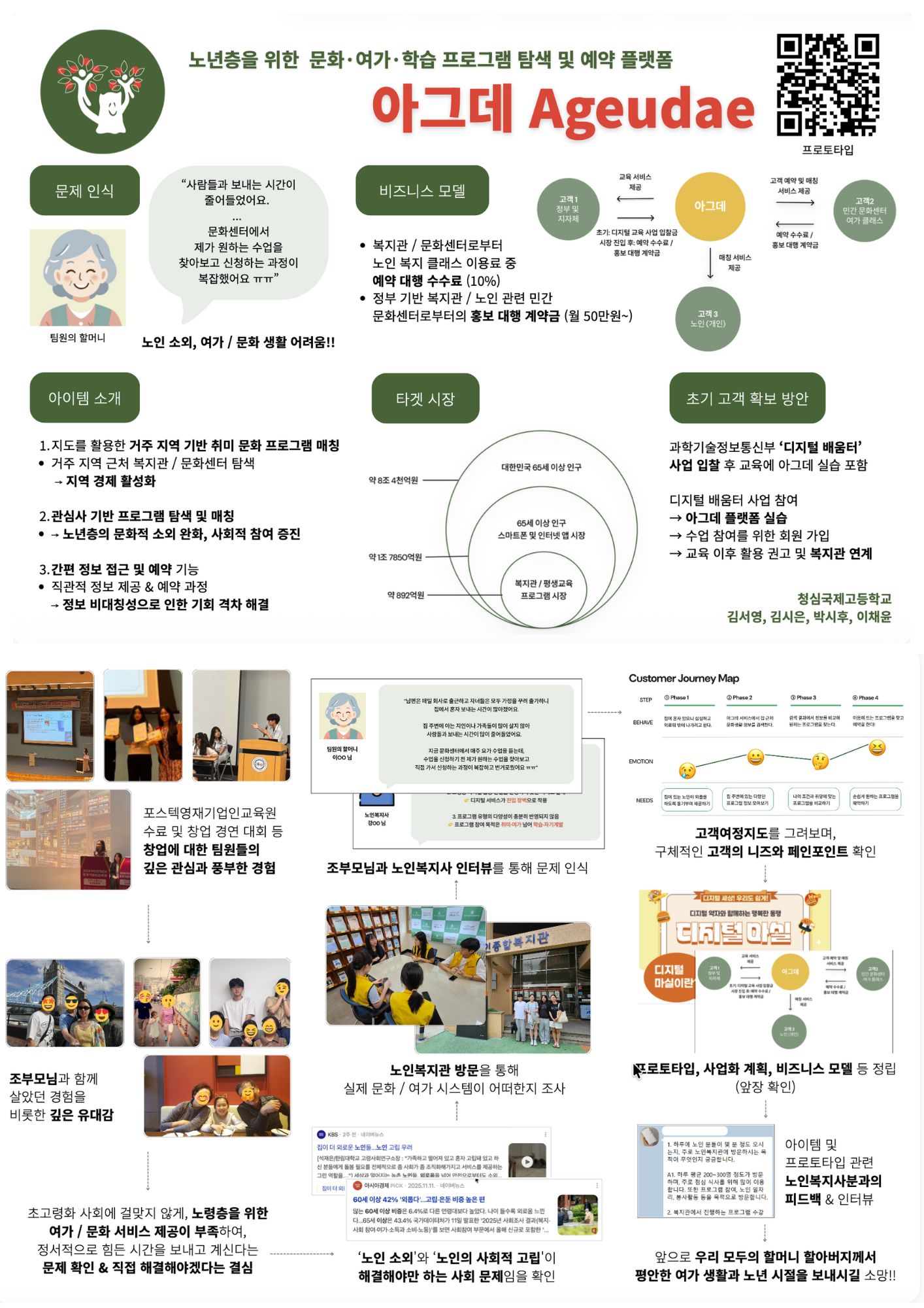 아그데는 청심국제고등학교 학생들로 이루어진 창업 팀으로, 노인의 사회적 고립 문제를 해결하는 문화 및 여가생활 정보 제공 플랫폼을 만들고 있습니다.