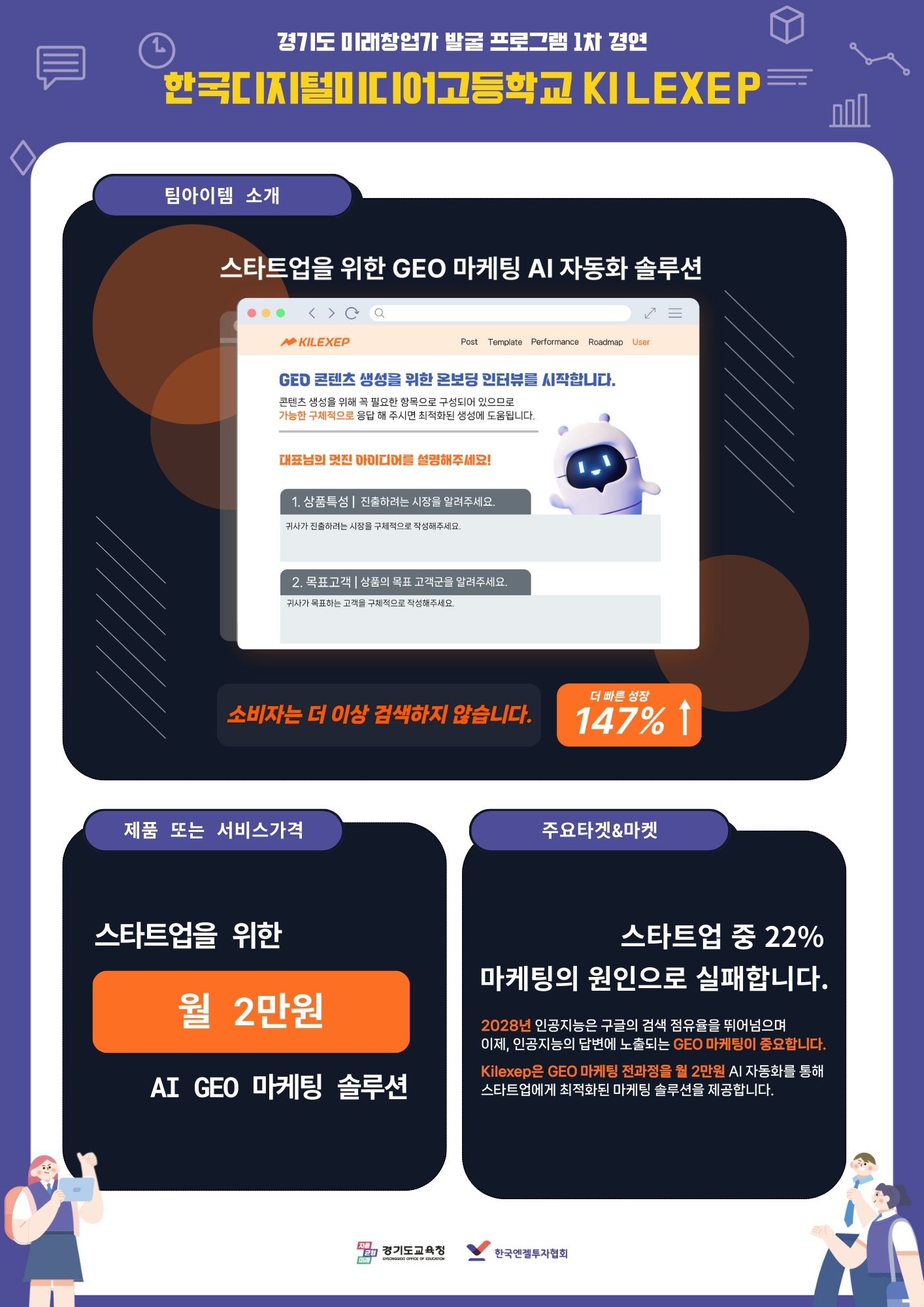 안녕하세요 한국디지털미디어고등학교 창업팀 Kilexep 입니다! 킬렉셉은 스타트업을 위한 GEO 마케팅의 전과정을 월 2만원 ai를 통해 자동으로 제공하는 서비스입니다. 2028년 인공지능은 구글의 검색 점유율을 뛰어넘으며 이제, 인공지능의 답변에 노출되는 GEO 마케팅이 중요합니다. Kilexep은 ai에 최적화된 마케팅 콘텐츠(GEO)를 자동으로 발행하여 스타트업이 목표하는 잠재고객이 ai를 통해 검색하였을 때, ai의 답변에 스타트업의 마케팅 콘텐츠가 노출되도록하여 기존 대비 147% 더 높은 마케팅 성과가 도출되었습니다.