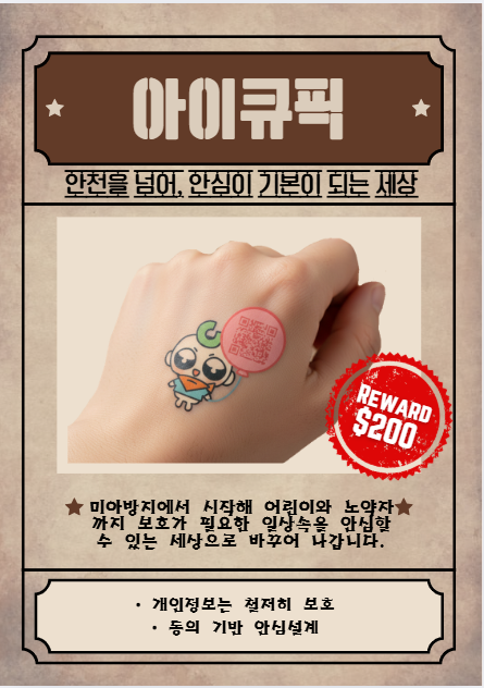 저희 팀 아이큐픽은 아이의 안전과 보호자의 안심을 최우선 가치로 삼아, QR 기반 미아 대응 솔루션을 개발하는 전문 팀입니다. 저희 제품은 QR 판박이를 통해 발견자가 아이를 발견하면 즉시 웹 기반 시스템으로 안내 화면이 표시되고, 발견자의 동의를 거쳐 보호자에게 아이의 위치와 연락처가 안전하게 전달됩니다. 이를 통해 아이를 찾는 시간을 최대한 단축하고, 개인정보 보호와 즉시성을 동시에 실현합니다.