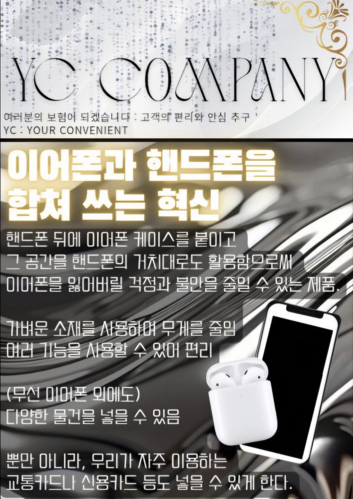 다들 물건 잃어버리신 경험 있으시죠?! 특히 이어폰 같은 거! 작고 가벼워서 분실율이 굉장히 높은데요, 이에 안타까움을 느껴 나온 게 바로 저희 회사 “YC company” 입니다!!! YC는 Your Convenient 의 약자로, 이름처럼 고객에게 편리함과 실용성을 제공하며 고객의 안심을 최우선 가치로 생각하는 기업입니다. 앞서 이어폰 분실에 관한 이야기를 했는데요, 지하철과 버스 등 대중교통에서 발생하는 분실물의 무려 59%는 무선 이어폰이라는 거, 알고 계셨나요? 무선 이어폰은 작고 가벼워 언제 어디서나 쉽게 분실되며, 다시 찾기도 어려워 재구매로 이어지게 됩니다. 버스 카드가 자주 분실되거나 휴대폰 거치대가 없는 경우, 충전 기능이 없어서 불편을 겪는 문제도 있습니다. 그래서 저희 YC Company가 만든게?? 바로 “YC 탈부착 케이스”라는 제품입니다. YC 탈부착 케이스는 이어폰 부착, 카드 수납, 거치대, 맥세이프 기능을 하나로 결합해 앞서 말씀드린 문제를 해결할 수 있게 만들어진 올인원 제품입니다.